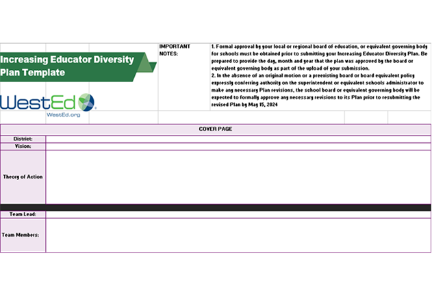 Creating an Action Plan and Sustaining Efforts to Increase Educator Diversity: A Toolkit for District & School Leaders provides practical suggestions for getting started with preplanning tasks, developing an action plan, and ongoing progress monitoring. Of great importance, this Toolkit includes the Increasing Educator Diversity Plan Template. While not required, the SDE materials strongly suggest using this template for plan submission.